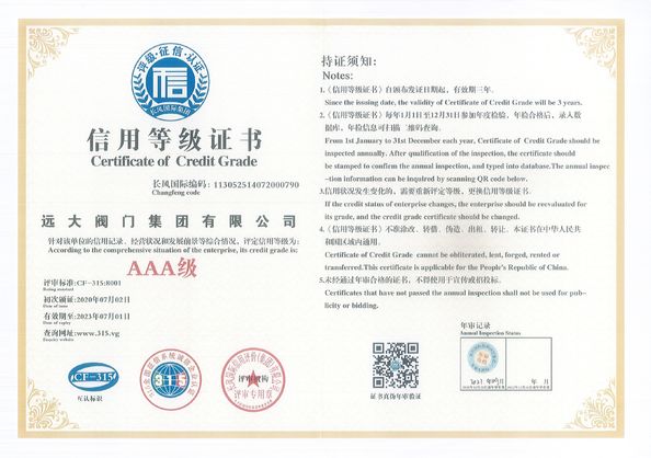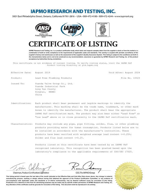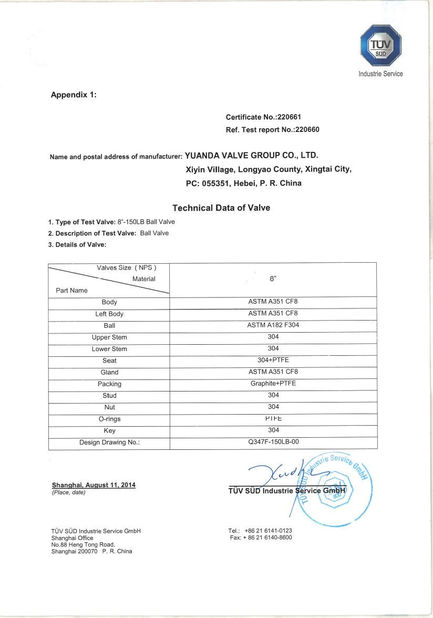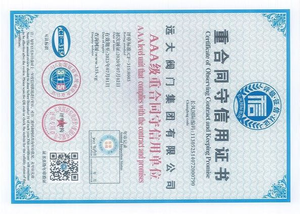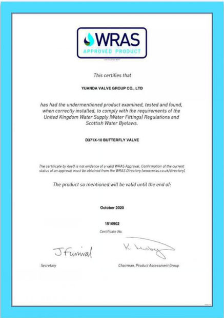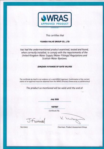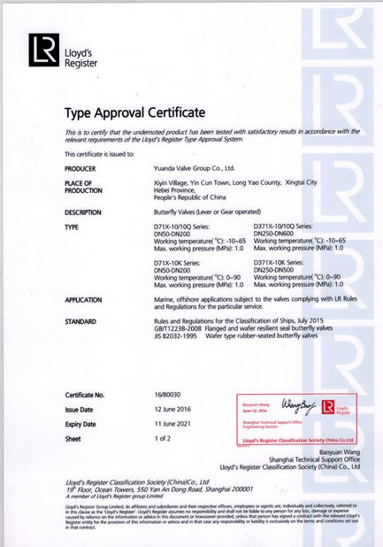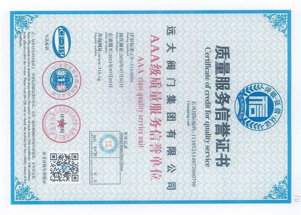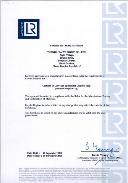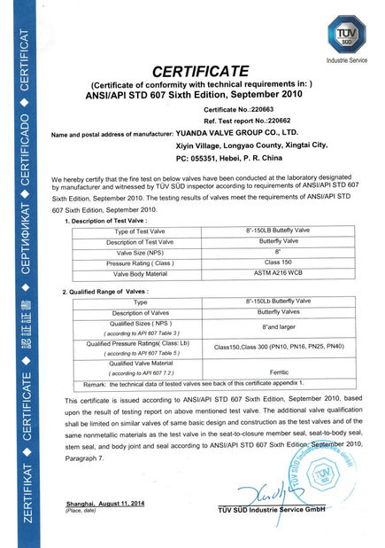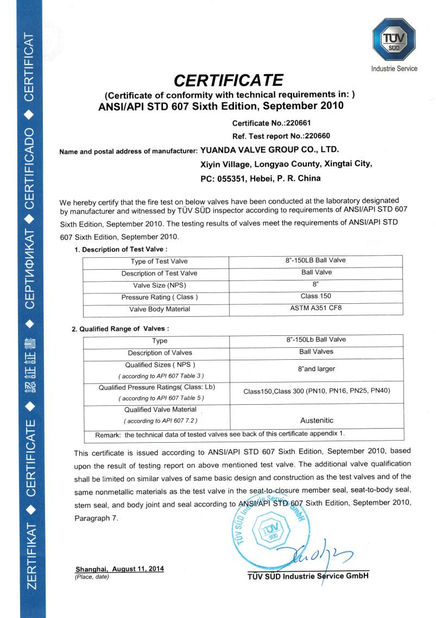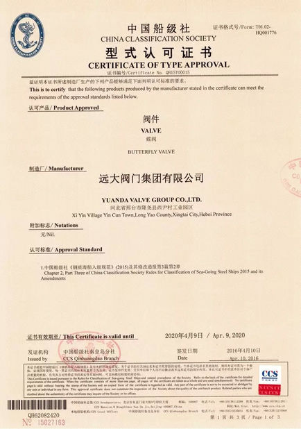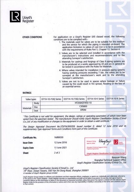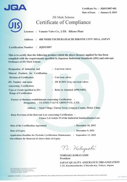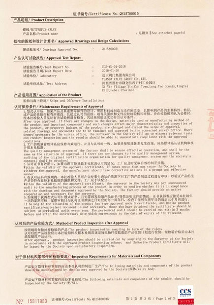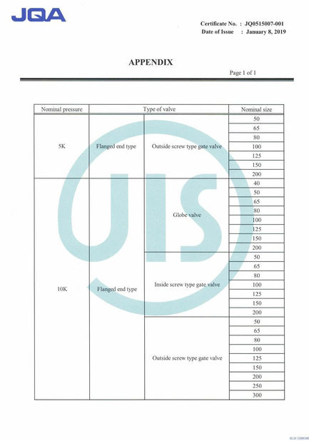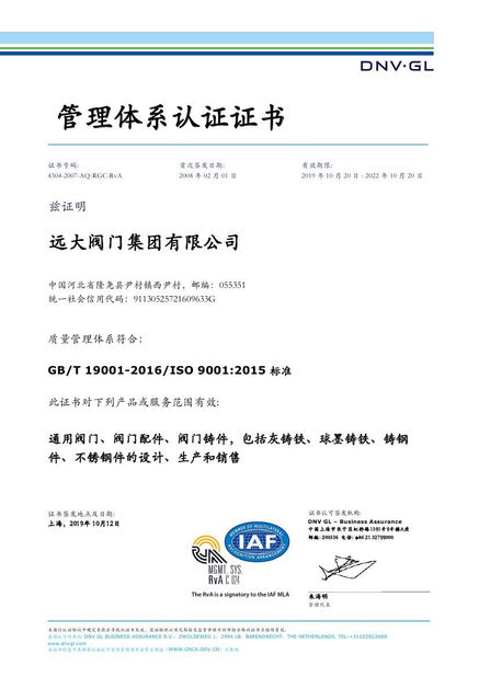 मानक:GB/T 19001-2016/ISO 9001:2015 संख्या:4304-2007-AQ-RGC-RvA मुद्दा तिथि:2019-10-12 समाप्ति दिनांक:2022-10-20 कार्यक्षेत्र/श्रेणी:Design, production and sales of general valves, valve accessories and valve castings, including gray cast iron, ball milled cast iron, steel castings and stainless steel parts. द्वारा जारी किया गया:DNV GL -Business Assurance |