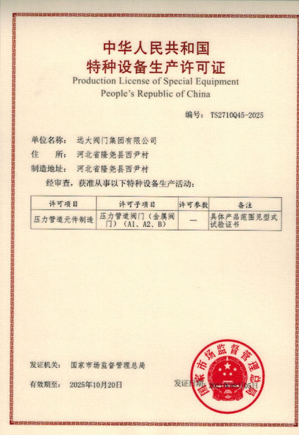 मानक:Production License संख्या:TS2710Q45-2025 मुद्दा तिथि:2021-08-05 समाप्ति दिनांक:2025-10-20 कार्यक्षेत्र/श्रेणी:Penstock valve द्वारा जारी किया गया:State Administration of market supervision |