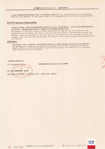 मानक:CHINA CLASSIFICATION SOCIETY संख्या:T01.02-HQ001776 मुद्दा तिथि:2020-04-09 |